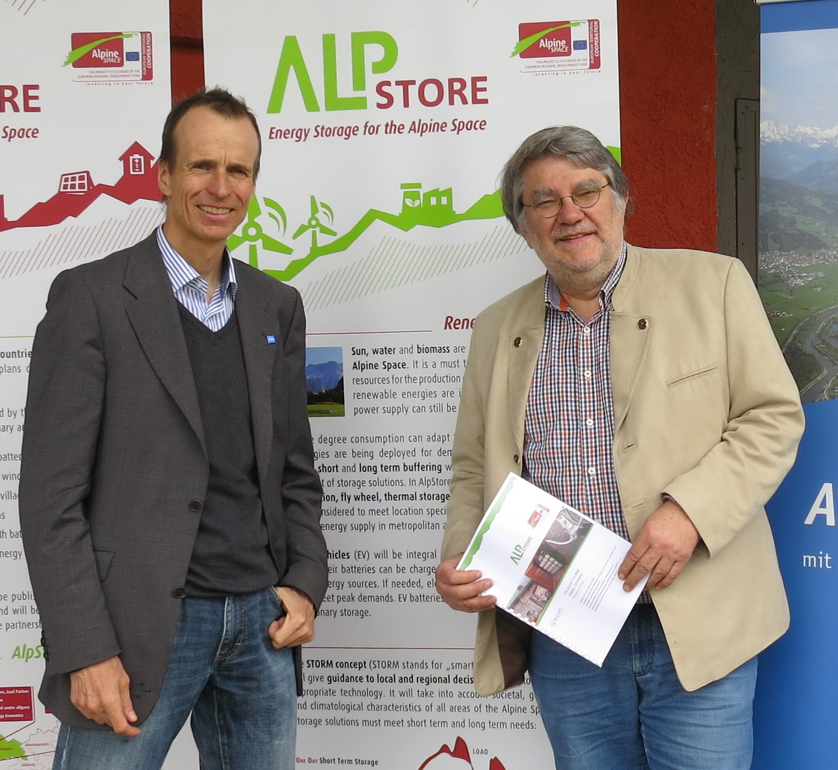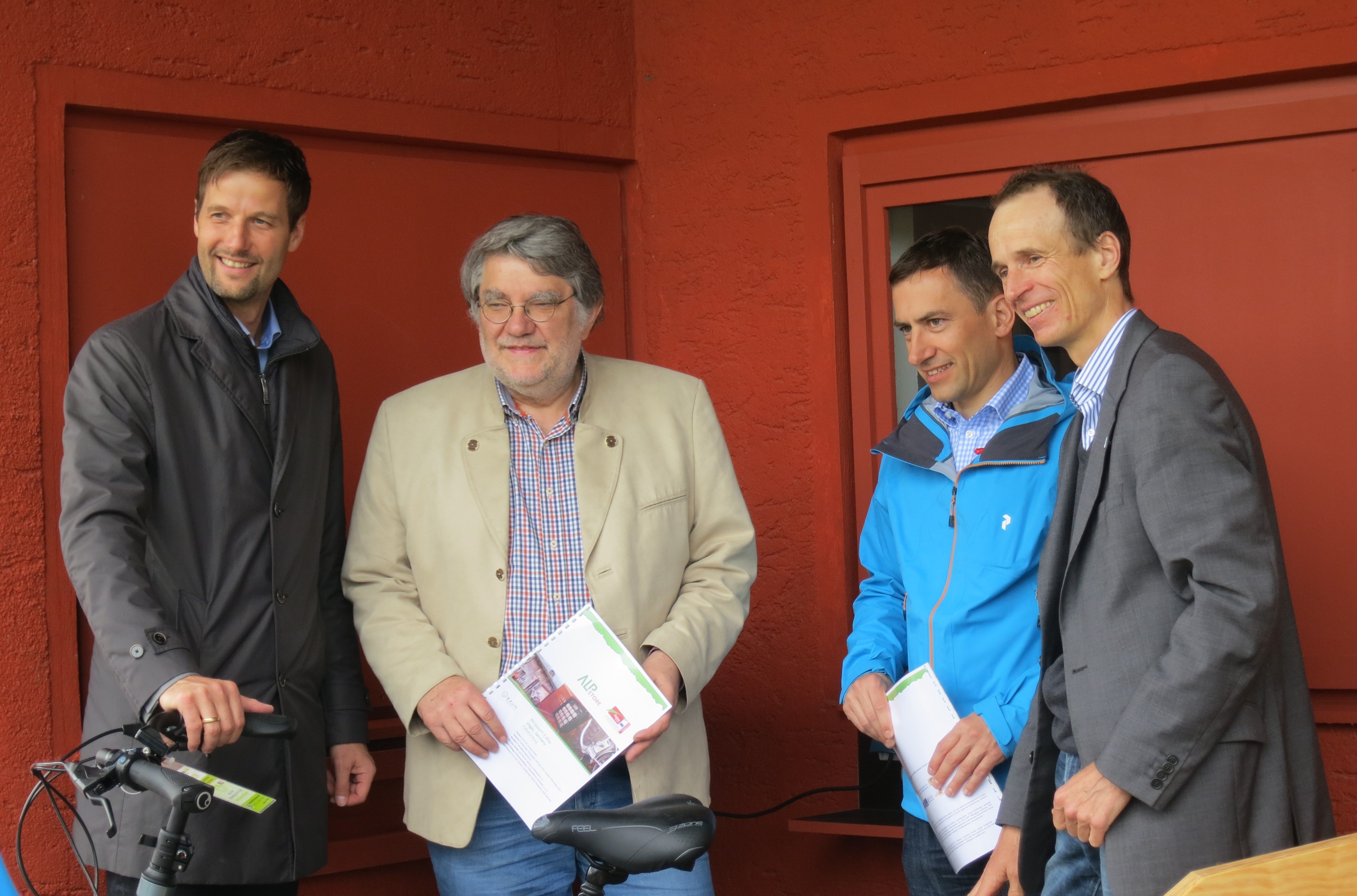 Kick-off for the PV-StorePlus E-Bike station at the Biberhof (f.l.t.r.): Ludwig Karg (CEO of B.A.U.M.), Andreas Repper (Climate Manager of Sonthofen), Martin Sambale (CEO of eza!), Dr. Hubert Lechner (CEO of AKW), Christian Wilhelm (Mayor of Sonthofen) | Heads of the AlpStore team in the Allgäu: Martin Sambale (CEO of eza!) and Ludwig Karg (CEO of B.A.U.M.). |
