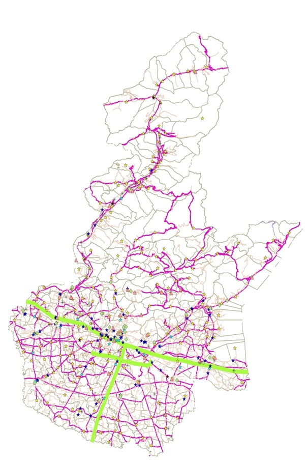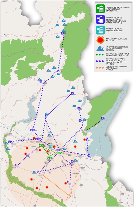 1. Two maps were defined for the location of the recharge stations in the Province of Brescia; in summary, 22 stations polarized on the location of renewable energy plants and along the roadway, and 444 stations near poles which attract traffic allow the complete coverage of the territory of the Province, allowing all the EV to move freely without restrictions, overcoming the range anxiety;